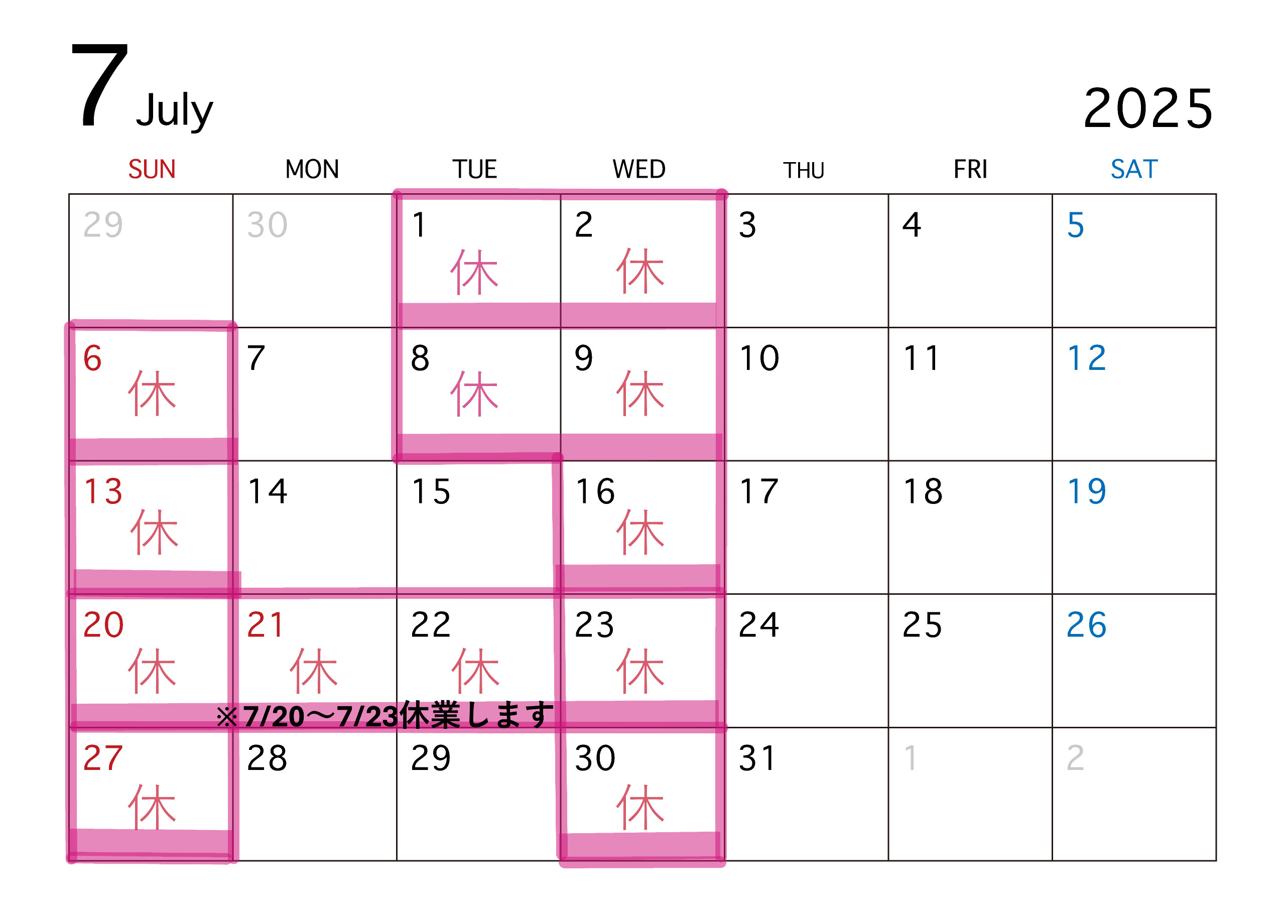 ※ 定休日との関係で、7月20日(日)~7月23日(水) 休業となります。